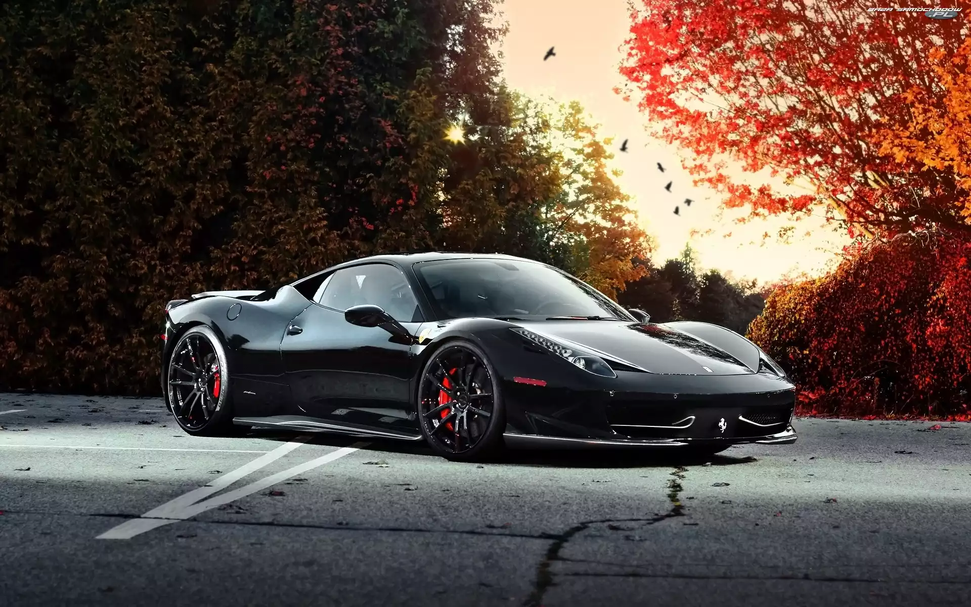 Samochód: 458 Italia, Czarny, Jesień, Ferrari, Samochód, Droga, Drzewa, Sportowy